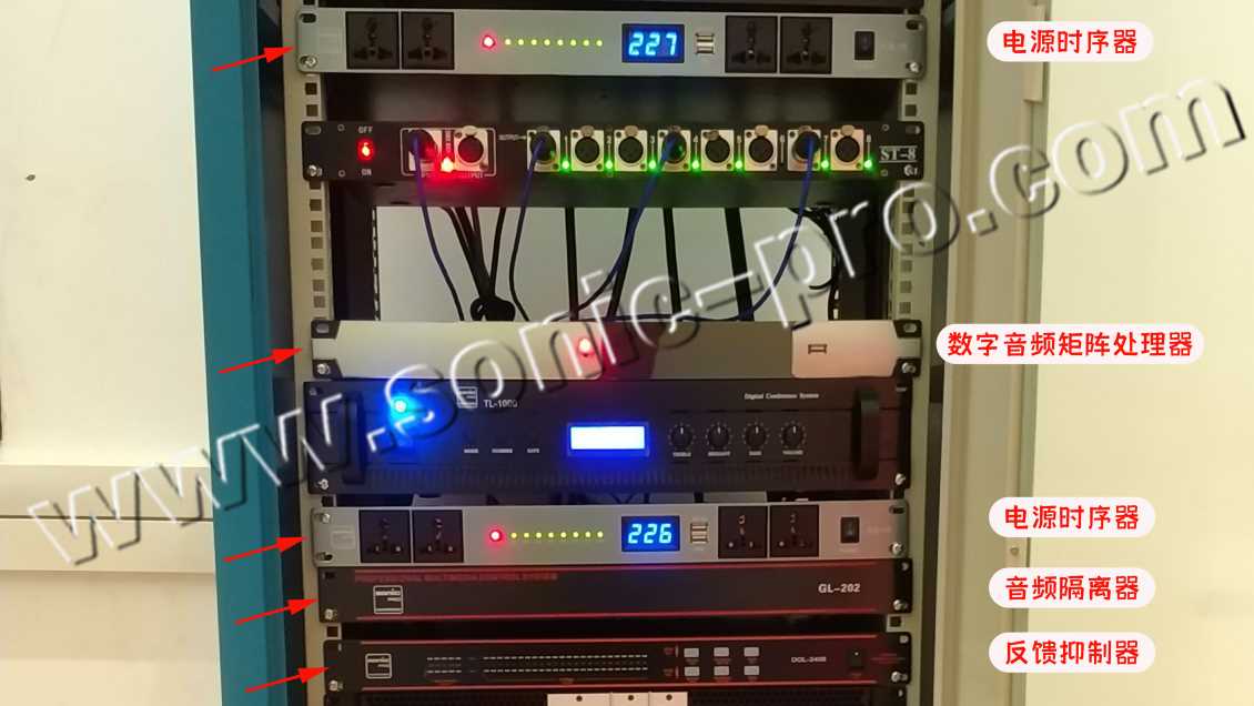 采用MATRIX808数字音频矩阵处理器、DGL-2408反馈抑制器、GL-202音频隔离器、CS-10电源时序器,其强大的处理功能能应对系统需求。