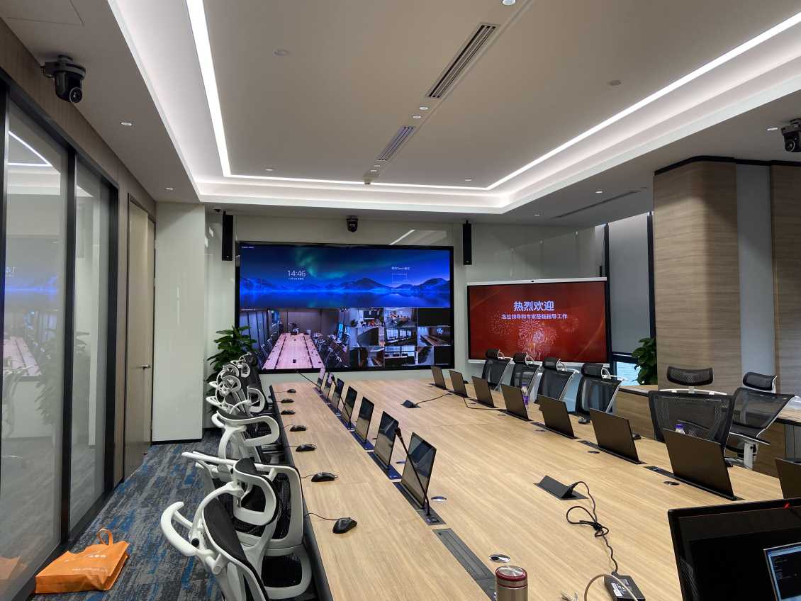 指挥中心的会议室用于平时的报告与会议演讲,我们选用了四只甘肃TH系列线性音柱,其独特的线性声源结构,声音均匀,保证现场有良好的声压级,语言清晰度和覆盖范围都非常优异。