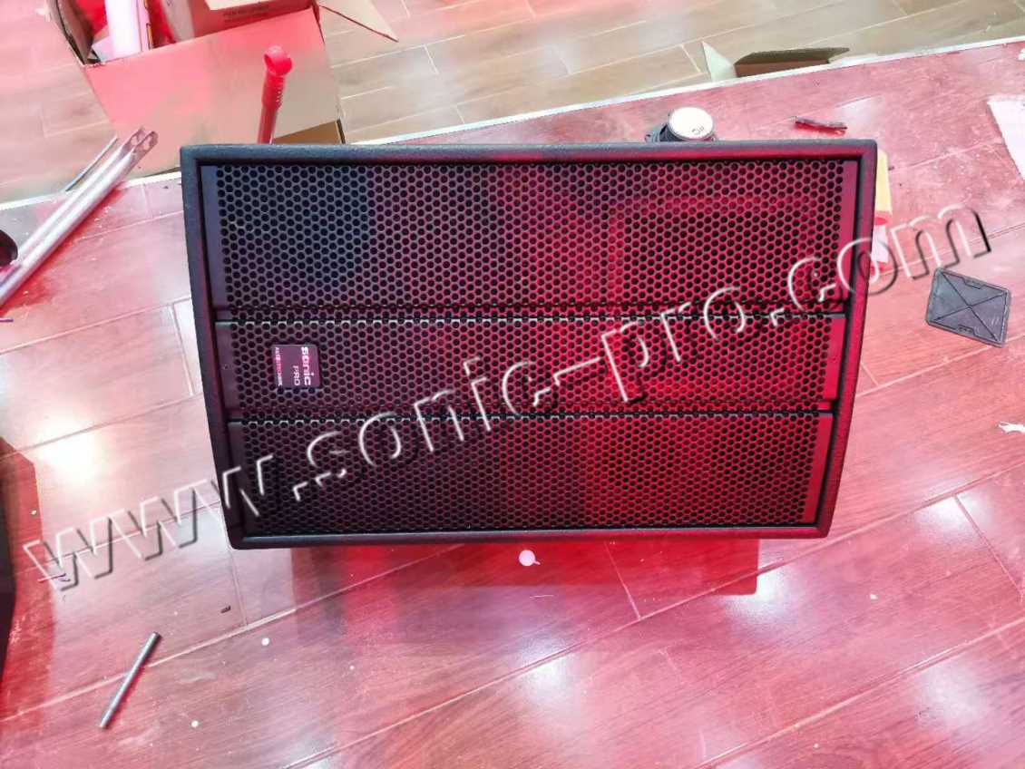 舞台台唇音箱,由于主扩音箱吊挂在舞台前两侧,中场区域会出现声压级不足的情况,我们配置了舞台台唇音箱。