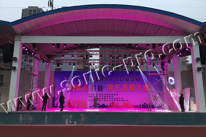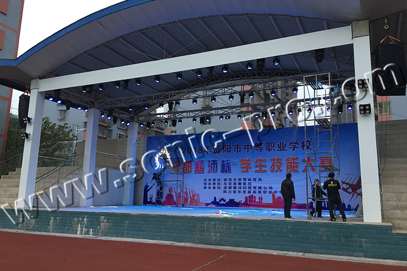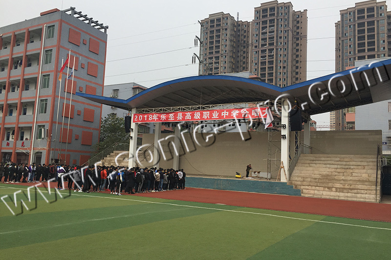 操场舞台主要用于举行晚会、发表演讲等活动,考虑到该场所作为一个户外的活动场所,相对比室内演出的声场处理难度较大。户外演出是开放式的,没有具体的反声建筑物,声音扩散出去没有反射声,因此就需要有强大的功率和具有良好指向性的扬声器。露天的演出在保证安全、顺利的前提下,也要考虑系统的稳定性、可靠性和实用性。