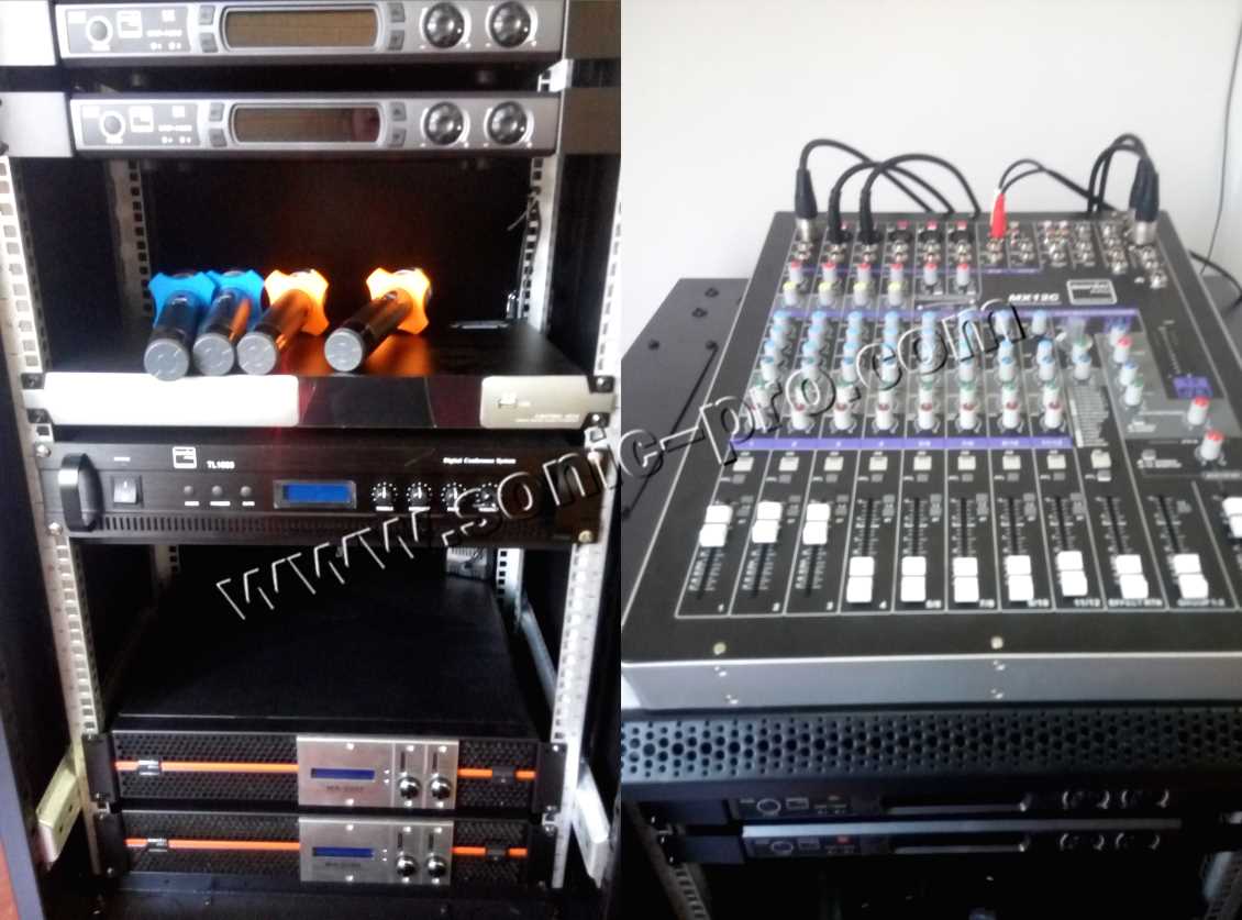 拾音部分采用了无线双手持甘肃话筒(UHF-1000)及手拉手会议系统(TL1000);