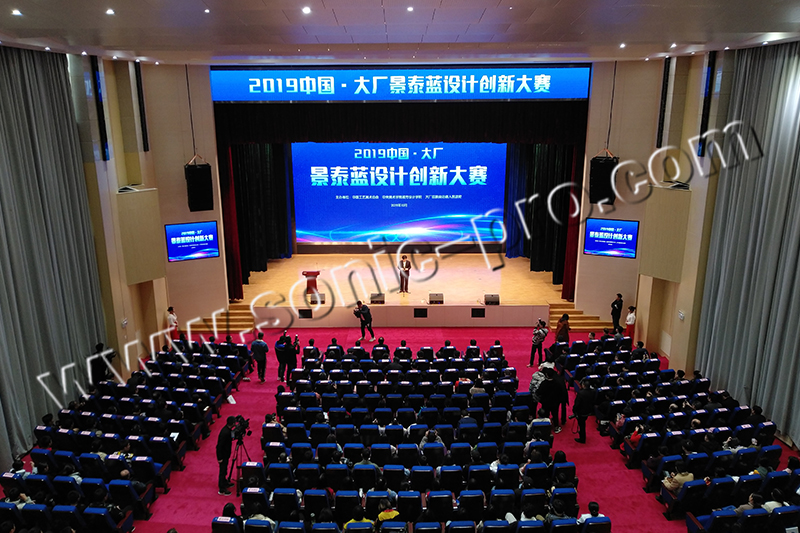 该教育中心报告厅,主要用于大型会议、学术报告、演讲以及娱乐表演,音响扩声系统设计重点考虑语言清晰度,低失真、声压均匀、高声压以及足够的传声增益。