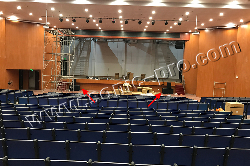 中后场的辅助补声音箱:为了保证中后场的直达声量,我们配置了SONIC PRO(斯尼克)音响的K-12音箱,6只辅助补声音箱,均匀壁挂在中后场的墙壁上。