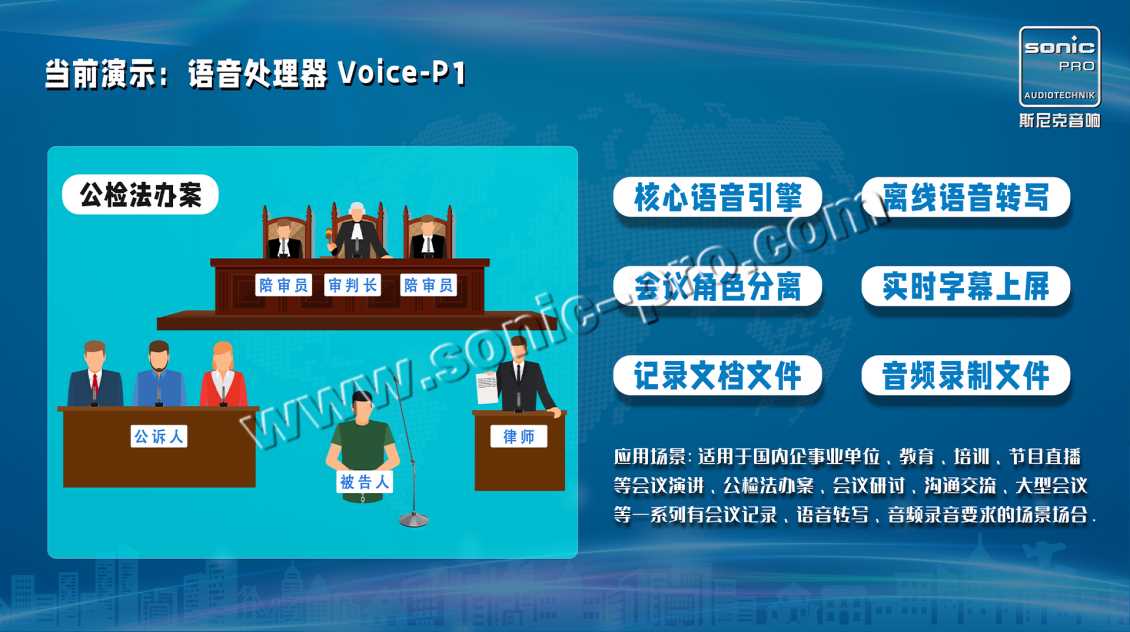 政企会议、公检法办案,教学培训等场合需要完整的文字记录材料,音视频文件也需要形成字幕,为了满足这个需求,我们推出了Voice-P1语音处理器,可以同时实现音频录制、转写成文档、同时也可以显示实时字幕,投放至大屏上。还可以根据会议人员实现角色分离。像在公检法办案的时候,我们可以根据不同人的角色,提前设置好名字,比如我们在法庭上,有审判长,公诉人,律师,被告人等等,当他们不同人发言时,记录文档和字幕都会显示出角色的名称。